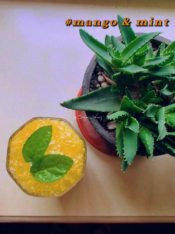 不能喝冰的人也🉑️拥有快乐 薄荷叶榨成汁,芒果榨成汁,气泡水准备好,再来两片薄荷叶装饰一下~