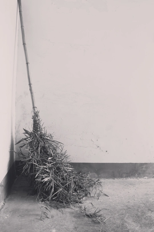 身伴畚箕影不孤, 任劳朝暮倚墙隅。 门前屋后残渣扫, 世上尘埃可净无?