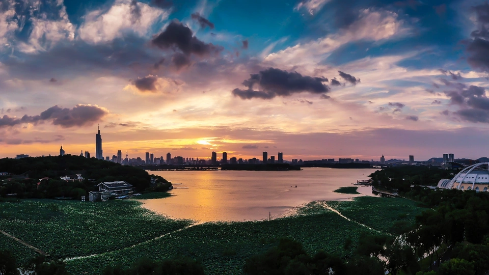 飞霞落日时的南京玄武湖和南京最好建筑“紫峰大厦”相映成画。