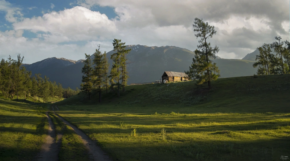 民宿窗外的小木屋,远处高耸的雪山,眼前日落下金黄的草原,仿佛在电影《海蒂和爷爷》里。