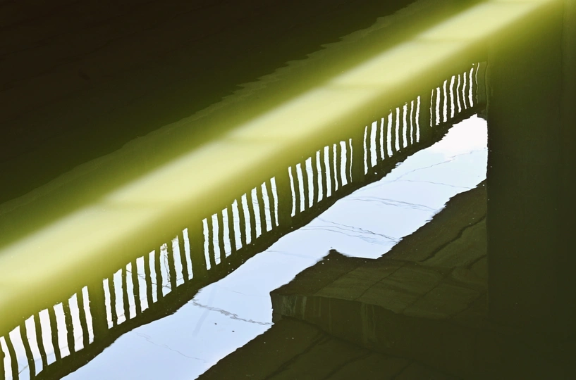 天桥的一道缝隙,阳光穿过直射在水面,桥墩,护栏,阳光。如果有和在护栏边那整个画面就完美了。