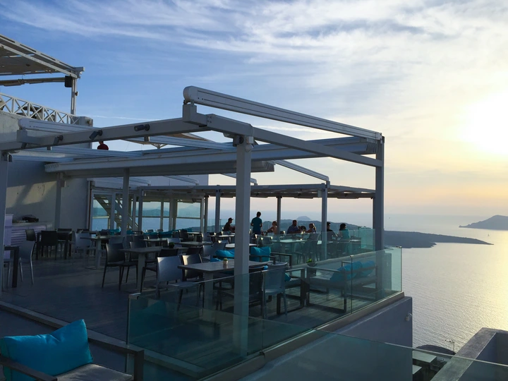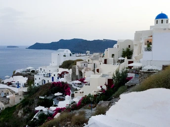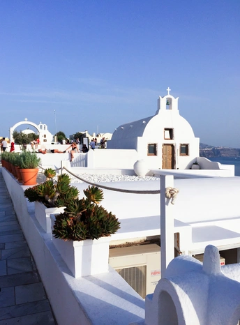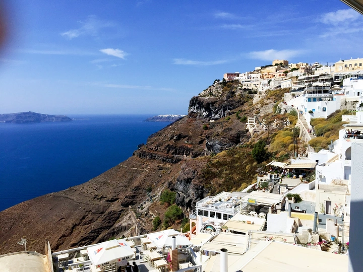 圣托尼里岛建筑的外墙全都是刷成白色,俗称“圣托尼里”白,这白色白的纯碎,干净,代表人们内心的圣洁与虔诚;屋顶是深蓝色,与天空、海洋浑然天成,蓝的明净,深邃,寓意着心中无限的期待和向往。蓝白相间,典型的地中海风格,面向辽阔的大海,远眺朝阳与晚霞,近看潮起潮落,它早就成了网红打卡的海景胜地。 无论用啥手机,随意一拍,都会上图片热搜榜,更不用是直接上个单反来定格每一个美丽精彩的瞬间。 Firostefani比费拉(Fira)地势更高,可以欣赏到看到更开阔壮丽的爱情海,收揽海天一色,帆影绰约壮观和观赏“月下飞天镜,云生结海楼”的大自然画卷 连接Fira-Firostefani-Imerovigli的悬崖步行道上是圣托尼里最美的悬崖石级路,满路皆是景观。游客络绎不绝,大有“长忆观潮,满郭人争江上望”之壮观。 伊亚是圣托尼里看最美日落的一个地方。位于圣岛的西北侧。除了屋顶是蓝色的教堂外,基本上建筑颜色也都是白色。房子错落蜿蜒散布悬崖中,很多窗户和台阶上都种有花草,蓝天白云映衬下,整个镇都面向大海,风景如诗如画。浓浓的文艺气息扑面而来。在伊亚可以见证“一道残阳铺水中,半江瑟瑟半江红的壮丽。