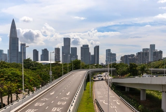 滨海沙河东立交桥人行天桥,周末下午4点左右,车流稀少,阳光热烈。