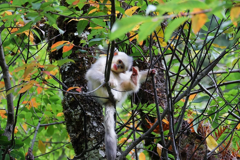 世界珍稀动物-滇金丝猴是我国大熊猫之后的第二国宝,主要分布在云南迪庆州白马雪山国家级自然保护区(位于金沙江与澜沧江之间),据调查,尚存13个自然种群,约1500只,数量极为稀少。2019.10.3.一只小滇金丝猴在树上做打招呼的动作。2019.10.3.摄于维西县塔城镇白马雪山。
