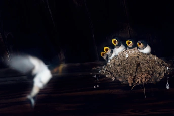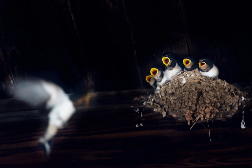 燕窝里一群还不会飞的雏燕看到燕妈妈飞回来,全部都张开小嘴在喊叫。