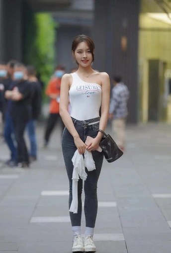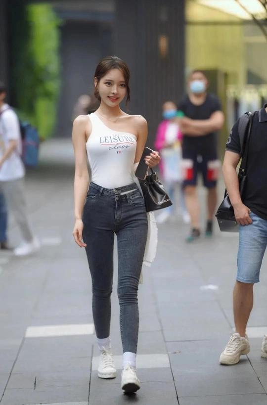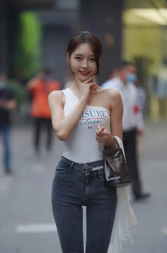 街拍女神:白单肩上衣灰修身牛仔裤的可爱妹