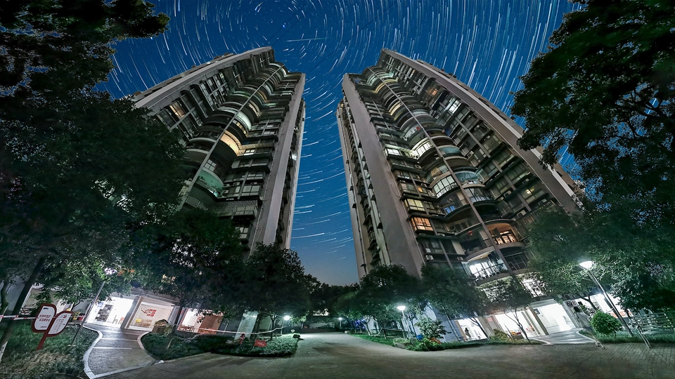 外婆家楼下拍摄,手机全景拼接,星轨素材来自无版权图片网站。