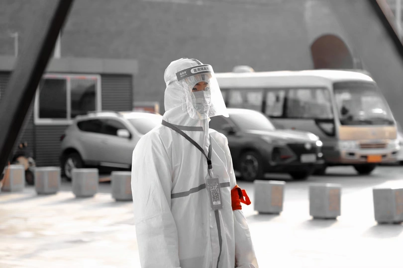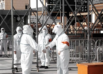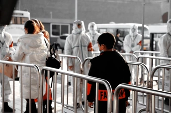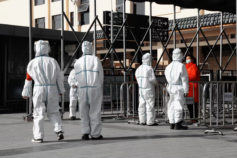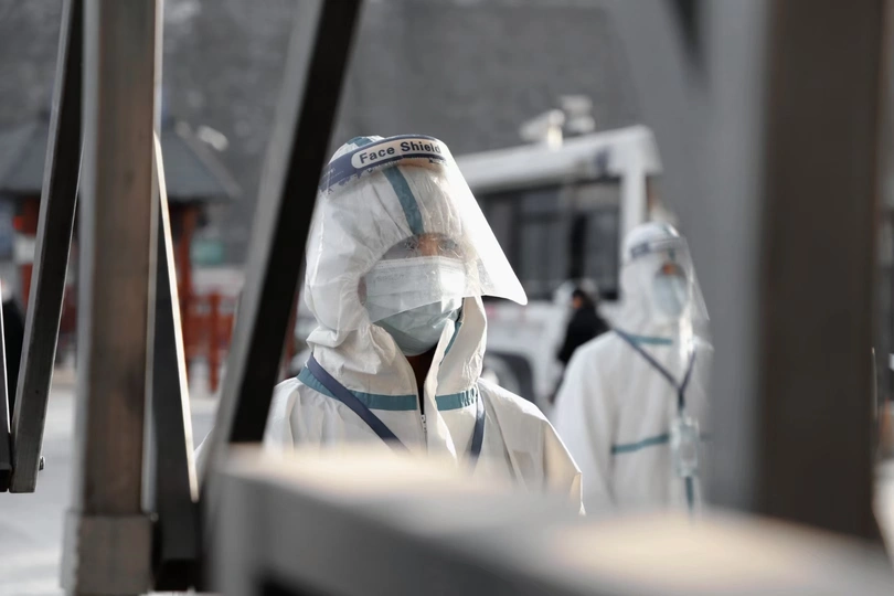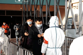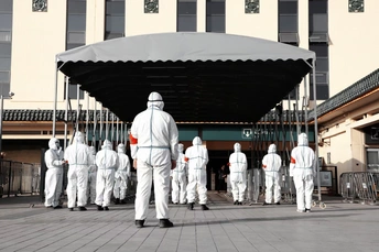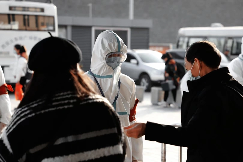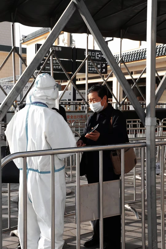 2021.1月 春运第一天 车站工作人员身着防护服在出站口检查