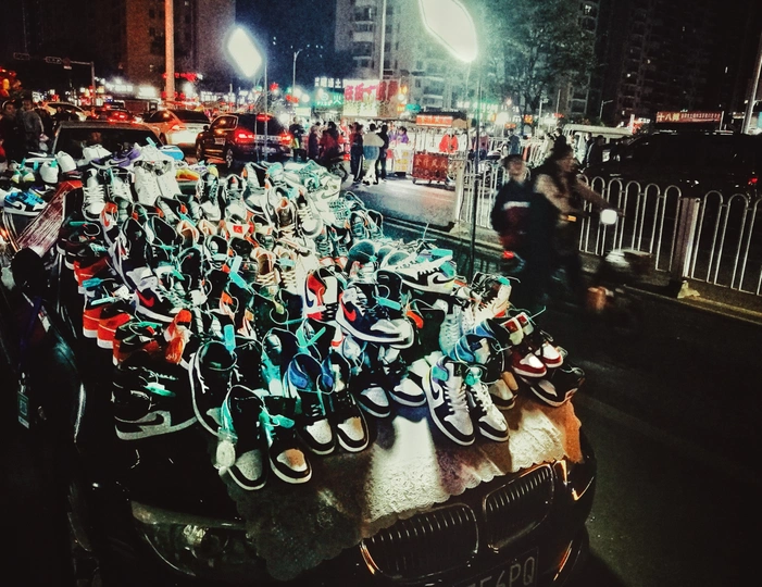 马路一侧被各种小摊占据,敞篷宝马上铺满了各种运动鞋。