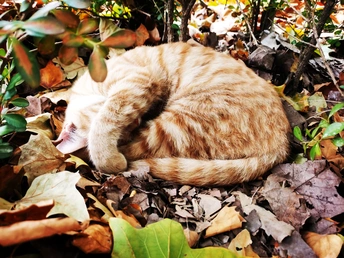 去找这只橘猫时它在睡觉,靠近她把她吵醒了,看了我一眼就挡住眼继续睡了[吃瓜围观]