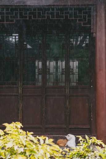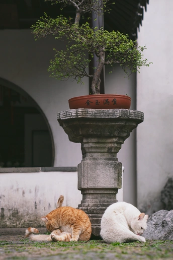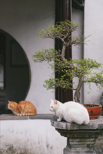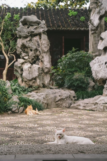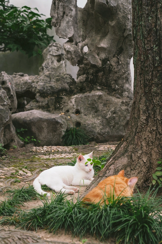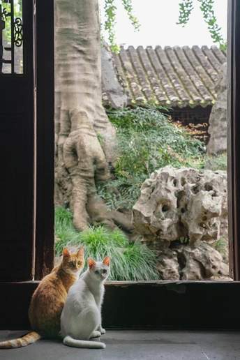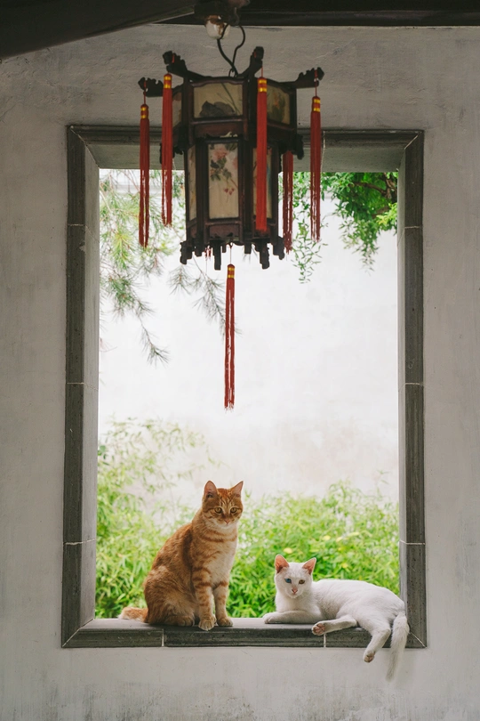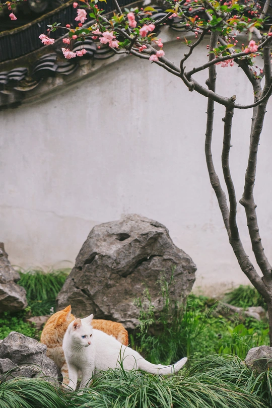 这对神仙眷侣,常常不是在腻歪,就是在腻歪的路上。亭前,树下,窗里,花中...每一处都是一幅古典画。 拍第五张的时候,两只猫咪突然回过头来,尤其是小白,那表情就像对我说:看什么看,没看过人家谈恋爱吗?!