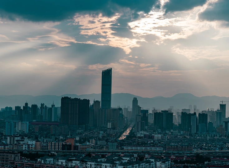 航拍昆明市区傍晚的丁达尔效应