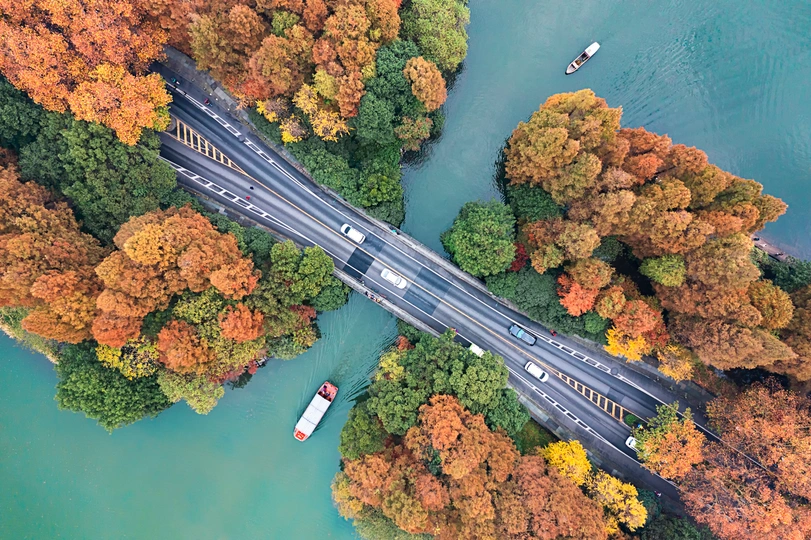 “西湖三堤”之一的杨公堤,相比于苏堤和白堤,游客较少,但景色丝毫不逊色。每到秋天,这里都会下起梧桐雨,整个杨公堤都被飘落的法国梧桐叶子染成了金色。一些梧桐叶还随风在半空中打着旋儿,漫天起舞,从空中俯瞰杨公堤,碧绿的湖水与金红的树叶相映,美不胜收。