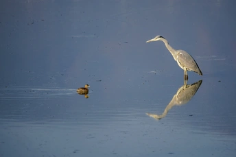 早晨,太阳刚刚升起,在抚仙湖北岸湿地里,早起觅食的苍鹭看着一只缓缓游过来的小䴙鹈,对影成双,和谐相处,互不侵扰。