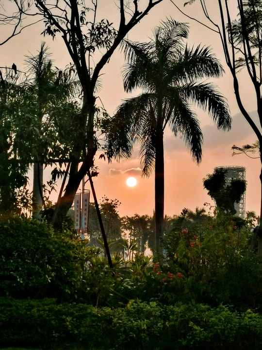 清晨,旭日东升照射大地万物,透过树木,落在花草丛上