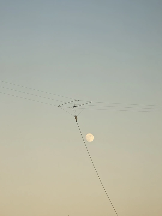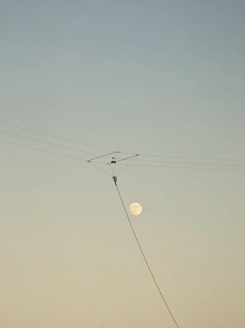 黄昏后, 月亮渐渐升起来, 渐渐暗下来的天空, 电线的剪影与月亮叠在一起, 就像风筝一般飞在天上。