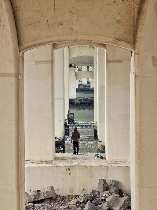 汕头东海岸新津大桥位于新津河汇入大海的出海口处,是淡水与海水混合处,经常有人来这里附近钓鱼。