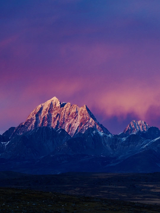 海拔4200米的鱼子西上遥望落日余晖中的山峰