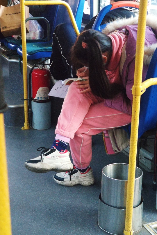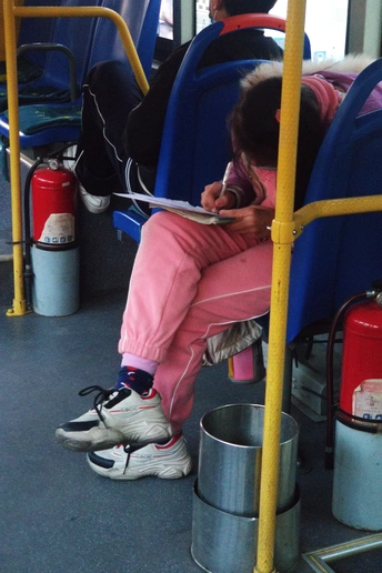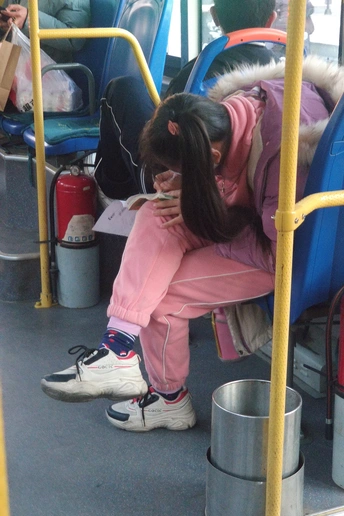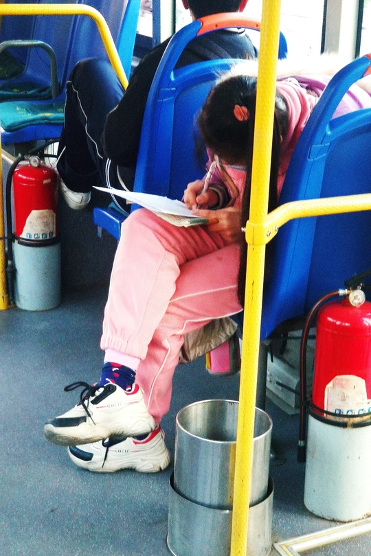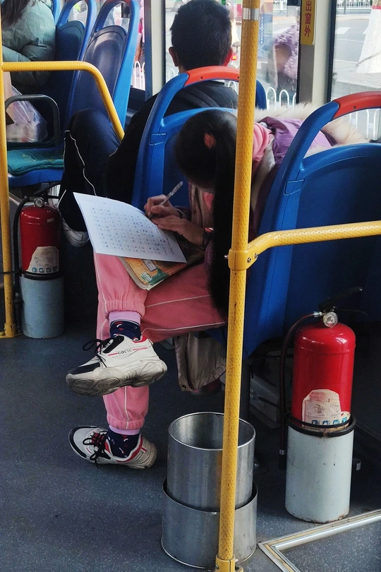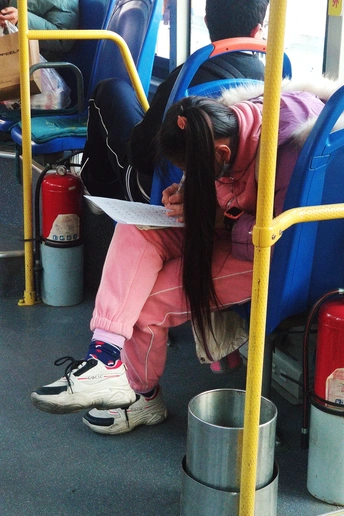 公交车上 一个流动的小社会 每个人 都在演绎着自己的人生 那个爱学习的小女孩 丝毫不想让坐车的时间无用的流逝 抓紧分分秒秒 认认真真把作业做好