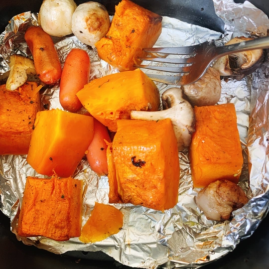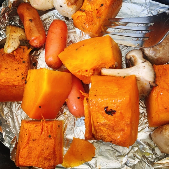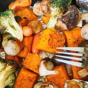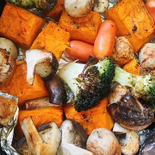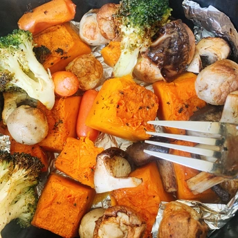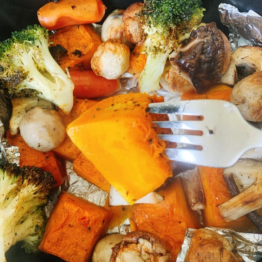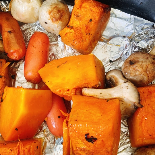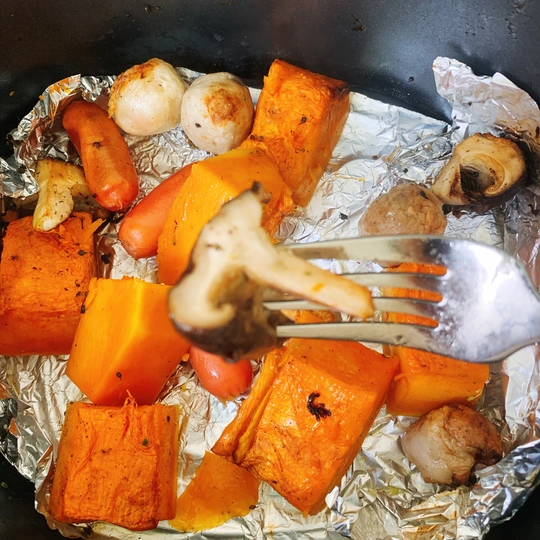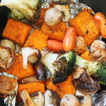(ง •_•)ง 吃好喝好,长生不老 (ง •_•)ง 白白胖胖,充满希望 中午一份烤杂蔬😍 👇做法如下:把南瓜🎃切块,西蓝花🥦切块,蘑菇🍄切块,放了鱼丸子然后放点油,盐🧂,黑胡椒粉拌拌烤着挺好吃,空气炸锅180°30分钟