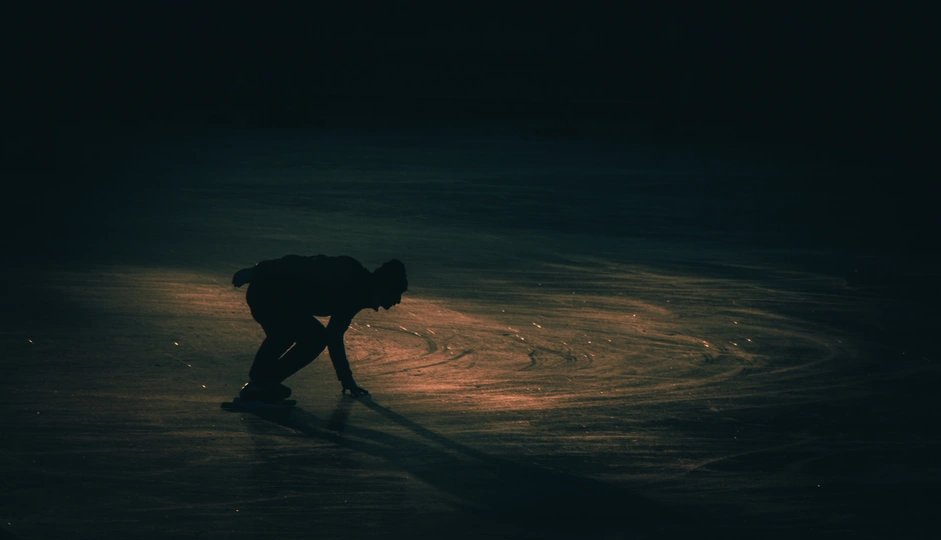 冬季午后,北京后海冰场的一位速滑爱好者,优美的身姿,利用阳光反射构成的一个剪影。