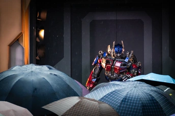 北京环球度假区变形金刚基地传奇现场,汽车人领袖擎天柱在雨中发表“演讲”。