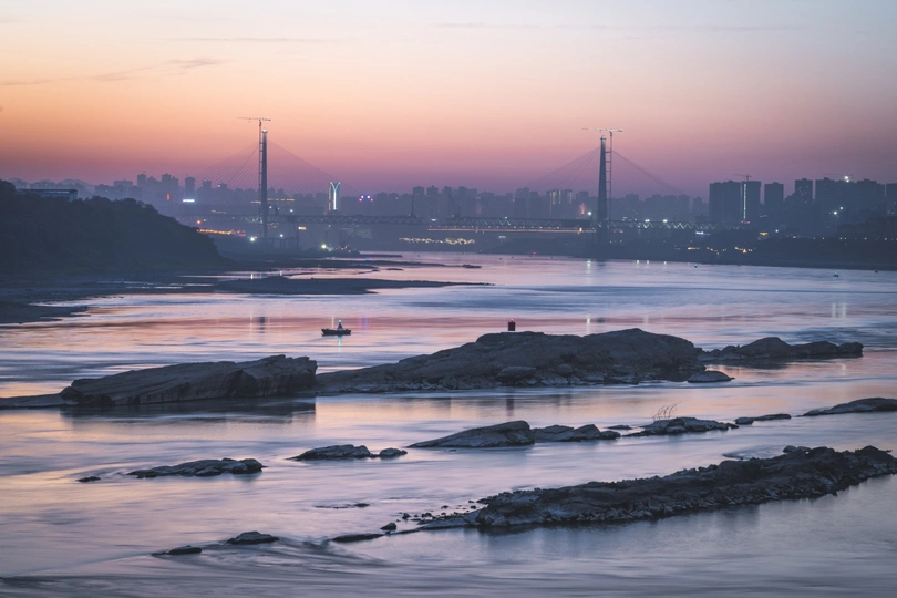日落黄昏总是叫人留恋,夕阳的余辉染红了天角,天光河色浑然相融,熠熠生辉,仿佛一日间所有的美好都汇聚在了此刻,化作五彩斑斓的颜色散落人间。 此图摄于鱼洞巴滨路,眺望当时还在建设中的白居寺大桥,当时下班回家,见天色如此美好,飞奔回家扛起相机,再马不停蹄地到了江边,总算是赶上了最后一抹黄昏。