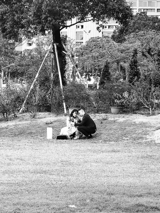 时代广场的草坪上,一对情侣拿着一束花在拍摄,互相探讨着拍摄角度。