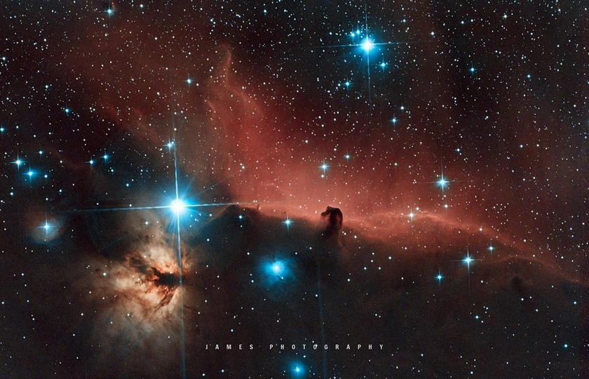 马头星云 马头星云位于猎户座,也称为巴纳德33(Barnard 33),在发射星云IC 434之内,是一个暗星云。这个星云就在猎户腰带最东边的参宿一南方,并且是非常巨大的猎户座分子云团的一部分。马头星云距离地球大约1,500光年,是最容易识别的星云之一,因为从地球看过去,黑暗的尘埃和旋转的气体构成的形状有如马头。这个星云的形状在1888年第一次被注意到,哈佛大学天文台的威廉敏娜·弗莱明在拍摄的B2312号干版中发现了这个暗星云。 天体编号:IC434 天文相机:ASI2600MC 赤道仪:信达 HEQ5 PRO 望远镜:信达Skywatcher 150/750 F/5 导星相机:ASI 120MC-S 导星镜:50mm 电动调焦:ZWO EAF 控制盒:ASIAIR PRO 窄带滤镜:Optolong L-Enhance 2英寸 累计天体曝光时间:3小时 亮场30张 600秒曝光 环境温度25度 拍摄温度0度 Gain 100 Offset 0 Pixlnsight 1.8.8-12处理 拍摄心得: 在前院拍摄马头星云还是有点提心吊胆,强大的路灯,过往的车灯。 凌晨四点一过赶紧把设备收回来,还好一切顺利。 太过耀眼的星芒有点毁了作品的感觉。 让我下定决心下单小黑魔改三件套,顺便在定个2047调焦座,小黑据说还可以换碳筒和抱箍,再换下去,除了2块玻璃,其他全改了。