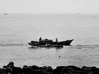 拍摄于汕头市东海岸外海湾。渔民开着小渔船开到外海湾浅水海域捕捞。