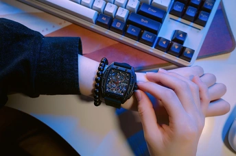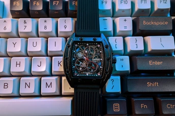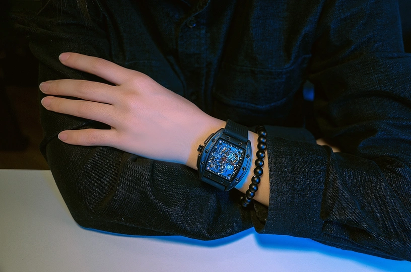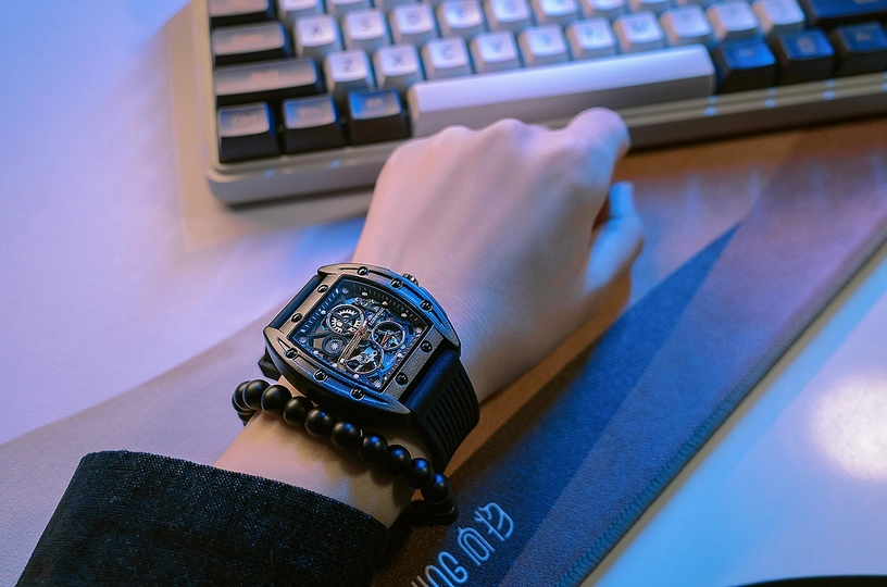 经过挑选我选了这款极具辨识度的酒桶方形手表,有着双面镂空的设计,超强的金属质感,全自动机械机芯,佩戴上以后,随着手臂的轻微摆动就能自动上弦,不用担心会因为忘记上弦而停止。 双面镂空,机械美学:经过几天的佩戴,走时稳定准确,调整时间的时候把头手握舒适,双面镂空的设计是我最喜欢的地方,可以直观的看到手表内部的机械结构,齿轮的传送与转动。平时安静的时候我就喜欢盯着手表,观察里面的转动,感受时光的流逝,治愈又美好~机械美学的魅力让人沉迷。 光影流转,金属质感:手表的外形采用酒桶方形设计,与传统的圆形相比,极具辨识度的同时,线条更加硬朗,更加适合型男佩戴。喷砂哑光的金属外壳,不会留下指纹,无惧平时的生活磨损和汗液侵蚀。深邃的哑光黑色外壳与表内闪亮的齿轮形成鲜明的对比。光影流转之间,质感尽显~ 弧形矿物表镜,亲肤硅胶表带:双面镂空的设计,搭配弧形的矿物质表镜,通透又耐磨,硬度极高,有效防止镜面刮花。透光度极佳,可以清晰又直观的感受机械之美。厚实亲肤的硅胶表带,质感细腻又不易脏污,清洗也更加方便。细看之下,细节设计完美,做工优秀。 硬朗魅力,3ATM防水:外形极具辨识度,硬朗的线条和凹凸的金属质感,