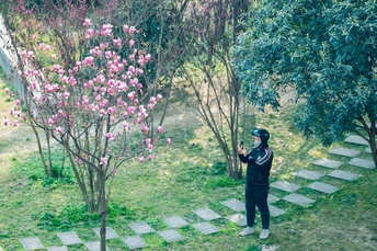 成都之春,图片应该是一个外卖员,驻足观看 春天,在成都和煦阳光下,爱美之心溢于言表