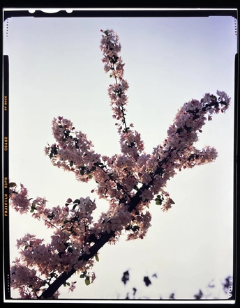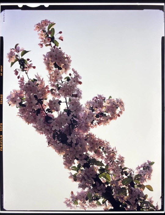 用4×5大画幅反转胶片拍摄开得正盛的垂丝海棠花,冲洗出来后用手机翻拍的底片?效果。