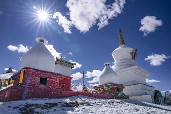 大雪过后的折多山垭口,晴天下的白塔建筑和雪交相呼应。