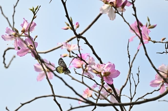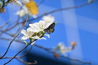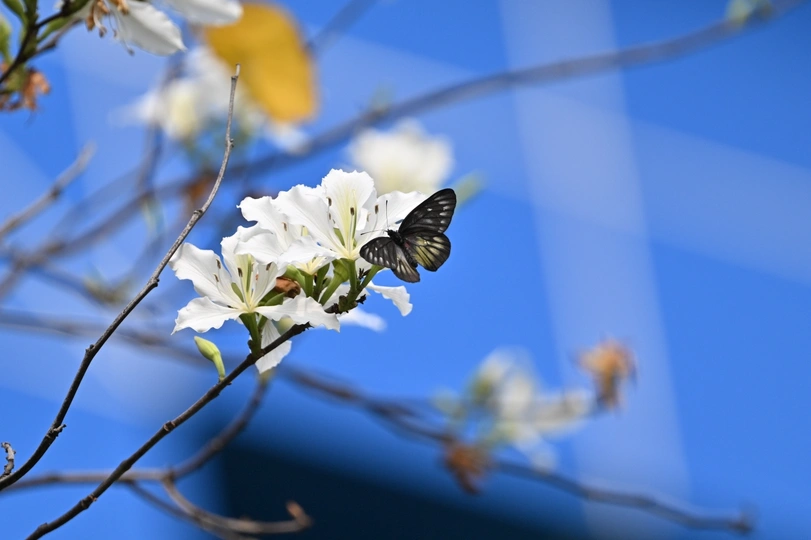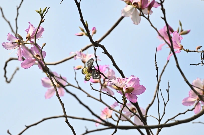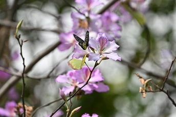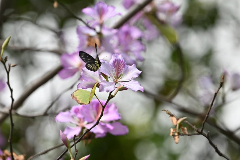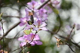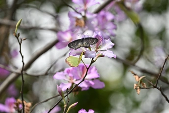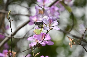 广东艳紫荆,现正盛开,不仅景色优美,微风轻拂树梢时,花瓣还会散发出淡淡清香,令大家为之惊艳。 艳紫荆自初冬开花,可陆续开至早春,现正值观赏好季节。尤其花色如其名,呈现艳紫红色,开花时成丛高挂枝头,被喻为“蝴蝶在树梢上翩翩起舞”,看起来相当美丽。 走在艳紫荆花廊下,除欣赏视觉飨宴,当微风轻拂树梢时,还会有片片花瓣飘落,散发出淡淡清香,加上艳紫荆亮眼外型,和美丽的蝴蝶惊艳组合更是美不胜收。
