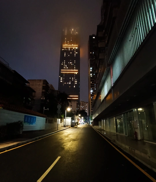 于夜晚的街道看向远处,高楼的灯光在雾霾中挣扎 手机拍摄,清晰度不高