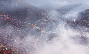 色达佛学院坐落在四川省甘孜藏族自治州境色达县县城东南方约20公里处,海拔4000米上。在重重的群山环绕之中,沟里的僧舍,以佛学院的大经堂为中心,密密麻麻搭满了四面的山坡,不计其数的浆红色小木屋,延绵无数,一眼望不到头。