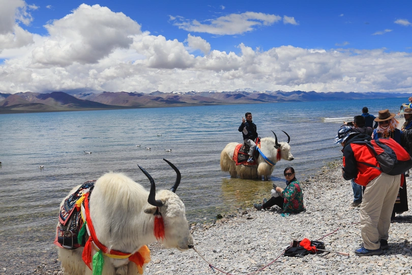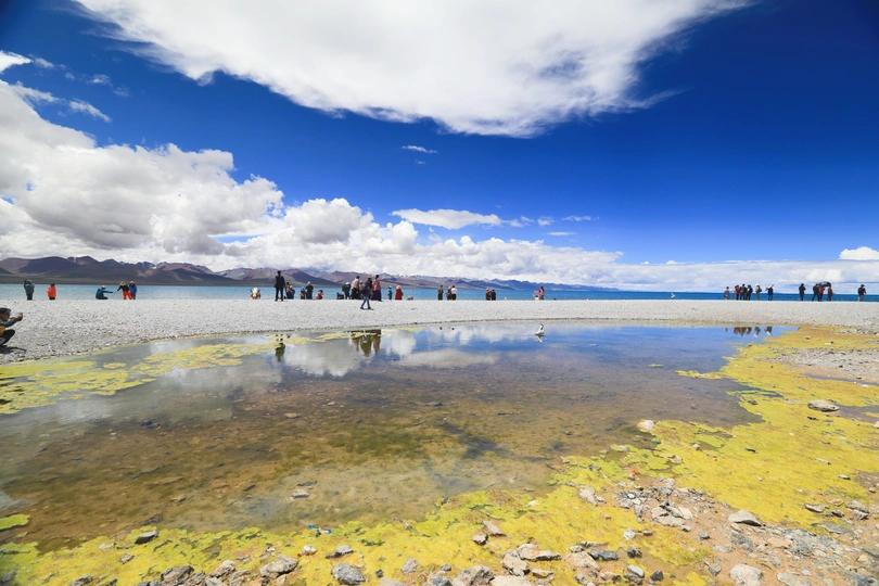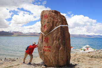 纳木错作为中国第二大的咸水湖。在西藏中部,湖面海拔4718米。湖的形状近似长方形,东西长70多千米,南北宽30多千米,面积1920多平方千米。湖水最大深度33米,蓄水量768亿立方米,为世界上海拔最高的大型湖泊。“纳木错”为藏语,而这个湖的蒙古语名称为“腾格里海”,两种名称都是“天湖”之意。 纳木错湖位于拉萨西北约两百公里处(当雄县和那曲地区班戈县之间),海拔四千七百余米,湖面面积为一千九百四十平方公里,是西藏湖泊之冠,也是世界上海拔最高的大咸水湖。 “纳木错”意为天湖、灵湖或神湖,是藏传佛教的著名圣地,信徒们尊其为四大威猛湖之一,传为密宗本尊胜乐金刚的道场。它的东南部是直插云宵,终年积雪的念青唐古拉山的主峰,北侧倚偎着和缓连绵的高原丘陵,广阔的草原绕湖四周,天湖象一面巨大宝镜,镶嵌在藏北的草原上。 清晨,湖面霭霭茫茫,周围群山若隐若现,太阳升起,云消雾散,清风拂面,浩瀚无际的湖面荡起涟漪,真似慈祥的仙女,手挥素巾注视头着来人,这时的念青唐古拉山的主峰格外清淅,牧场一片浅绿,山体红黑间杂,峰顶白雪皑皑,主峰如一个威武战士守护着纳木湖。