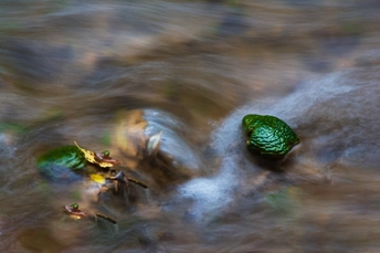 一个乌龟形状的石头上长满苔藓,在狂风骤浪中永不退游,长年停留于此。 此处流水中有多个这样长满苔藓的绿小石头。 不知道是原始生根于此还是后人为了游人观赏而制造。