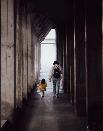 我路过一间老房子,看见一个大人和一个小女孩在走道上走路,房子里的光线投在他们身上 非常漂亮