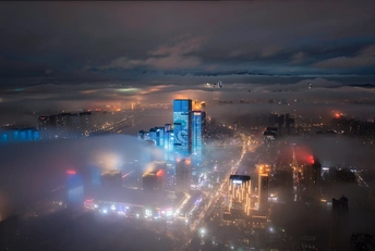 下雨过后水气上升雾气腾腾,平流雾和城市璀璨的灯火,彰显城市之美。