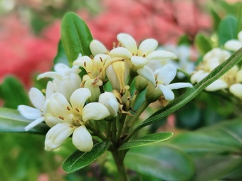 海桐,四季常绿的乔木,椭圆形状的叶子碧绿,春天开着细小的圆形小白花,站在近处观赏,会有一阵沁人心脾的幽香向你袭来,让你回味、陶醉,在小区或公园的小径旁,时常会见到它的身影。 记住我,是海桐的花语。
