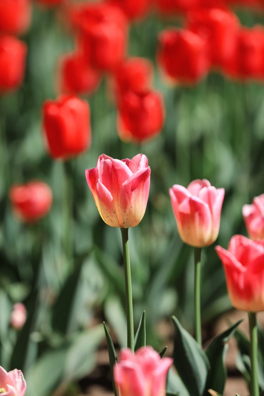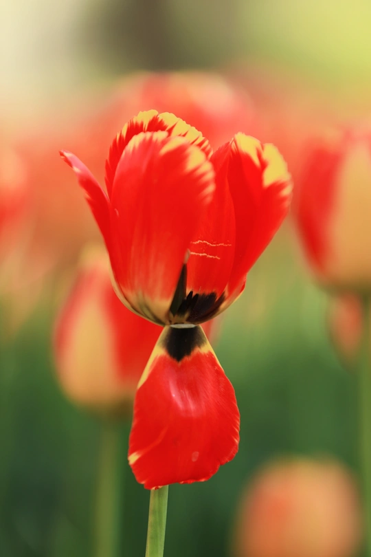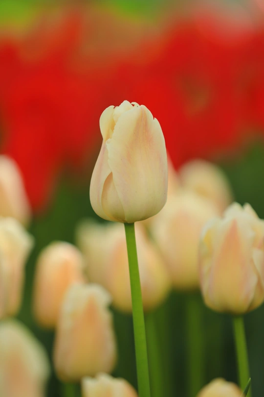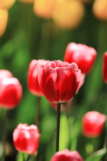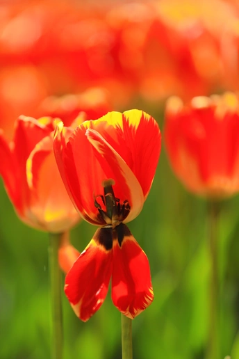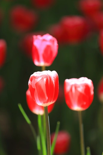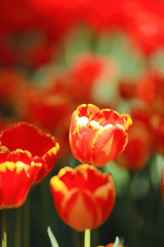 郁金香(学名:Tulipa gesneriana L.)是百合科、郁金香属植物。叶3~5枚,条状披针形至卵状披针状,花单朵顶生,大型而艳丽,花被片红色或杂有白色和黄色,有时为白色或黄色,长5~7厘米,宽2~4厘米,6枚雄蕊等长,花丝无毛,无花柱,柱头增大呈鸡冠状,花期4~5月。 原产于土耳其,后引进欧洲,17世纪中叶在比利时、荷兰、英国风行。19世纪进入中国上海,20世纪初南京、庐山等地都先后引进应用。中国各地均有引种栽培。[3][13]郁金香属长日照花卉,喜向阳、避风,冬季温暖湿润,夏季凉爽干燥的气候。喜腐殖质丰富、疏松肥沃、排水良好的微酸陛沙质土壤。 郁金香是重要的春季球根花卉,适宜丛植布置花坛、花境,也可作切花、插花装点室内,还可盆栽供冬季观赏,郁金香入药性昧苦、干。花可除心腹间恶气;根能镇静。