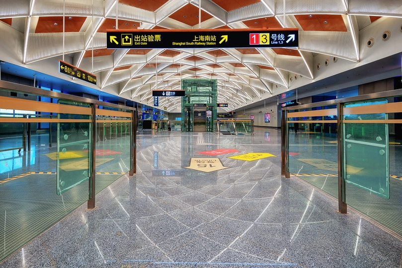 上海地铁15号线站厅设计层设计无公共区立柱,将主体部分的顶板设置成弧形顶提高空间感。给人高大开阔的视野;现代,简洁,色彩明快。