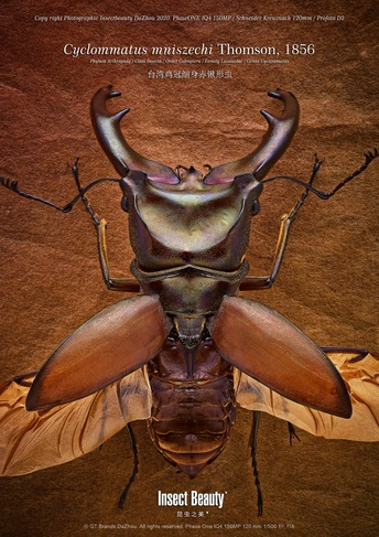 作品名称:台湾鸡冠细身赤锹形虫 作者署名:大洲(邹德新) 前期思路:在昆虫摄影中,一般采用焦点堆栈的方法获得全焦段清晰的影像,如这头台湾鸡冠,拍摄约80-120张断层,之后在堆叠软件里进行合成从而获得全景深影像。得益于飞思中画幅相机的高解析力,重要细节都能够一一展现。 后期思路:这种昆虫摄影属于分类学知识结构,每种昆虫定名和标注是必不可少且有通用的拉丁文格式。这种体系源自于瑞典生物学家林奈(Carl Linnaeus 1707~1778)创立的动植物命名的双名法,他为现代昆虫分类学奠定了基础。