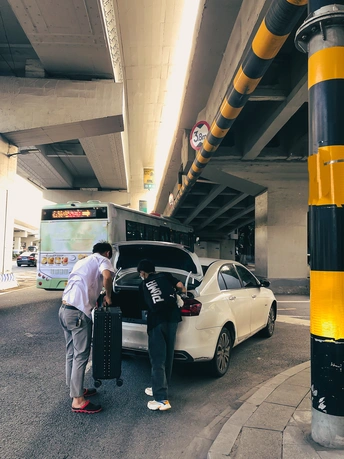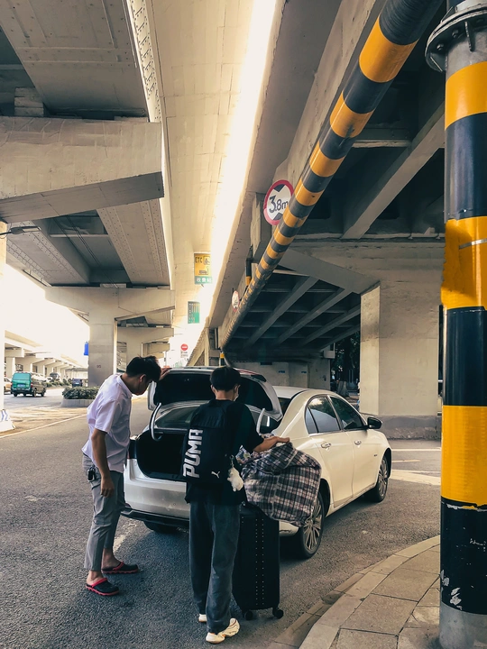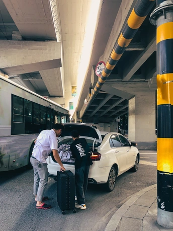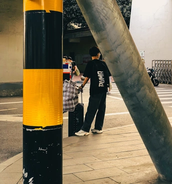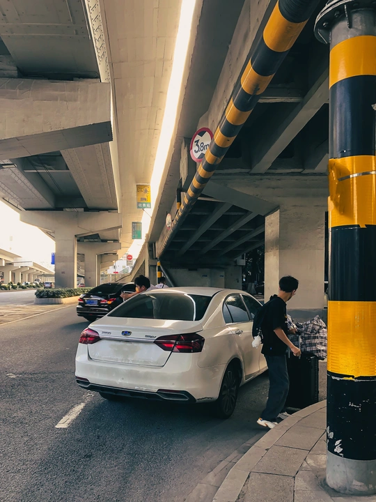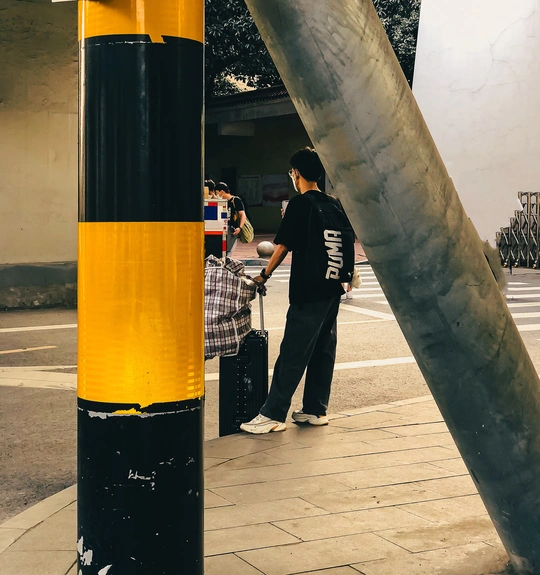 路遇一个站在高架桥下,刚好站在防高栏两根柱子中间,画面和谐,而且色彩丰富,他站在那里没多久叫的车到了,便拖着行李上车。踏上旅途