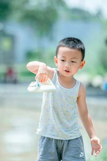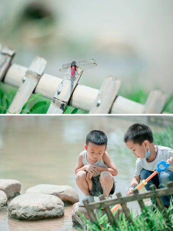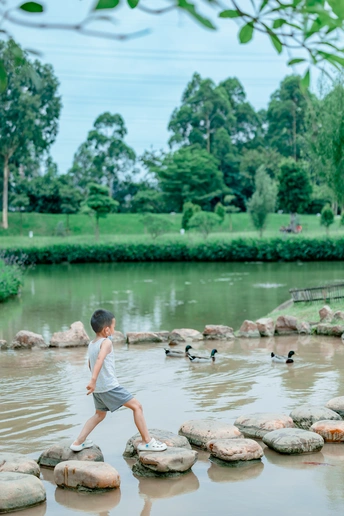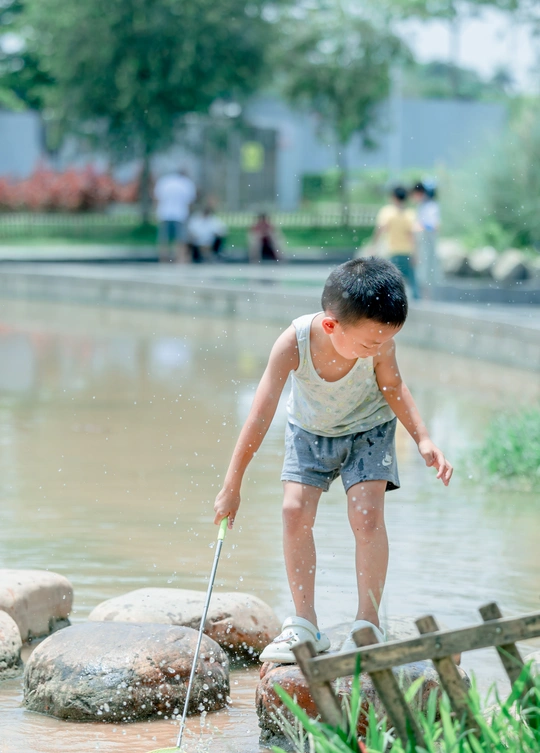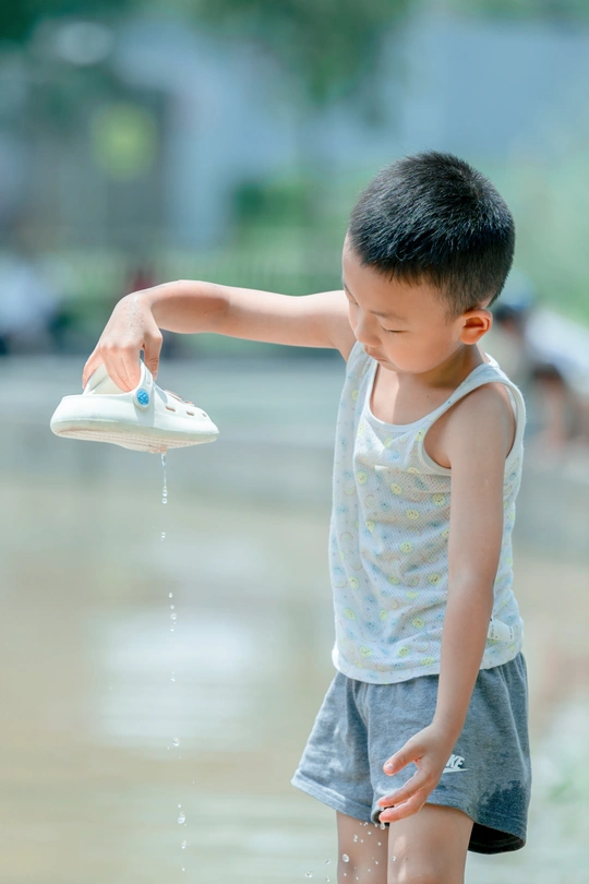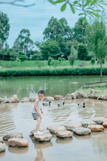 “夏天了,捞蝌蚪 结果一不小心鞋子掉水里了 去捞鞋子,结果裤子也湿了 但是也不影响我愉快的玩耍 哈哈”