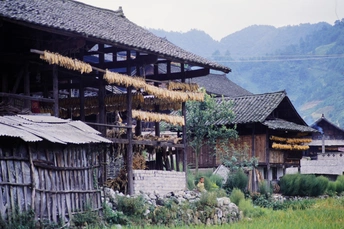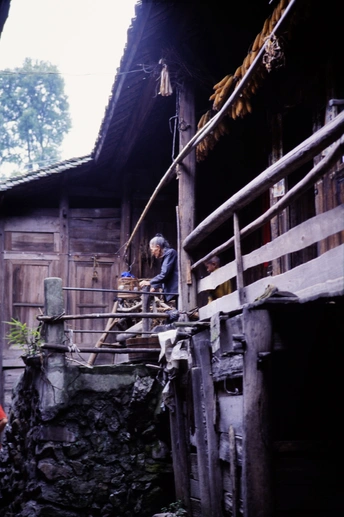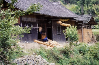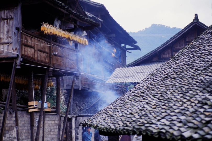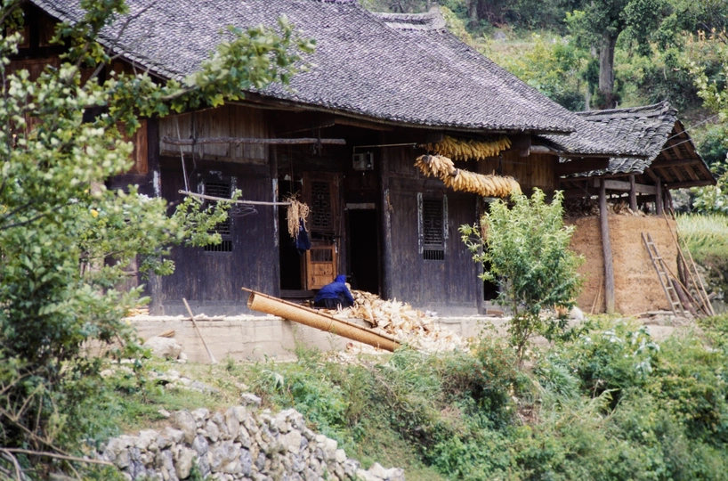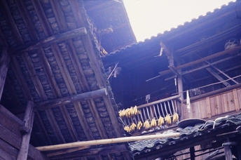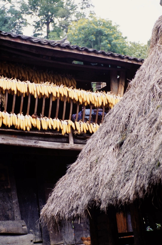 在游历山间村寨的时候,我注意到一个情景,之后会很喜欢并留意,这些屋檐下挂着的玉米。 不过我并没有刻意去了解为什么,只是私自揣测,因为这些挂着的玉米给我一种“家有余粮”的感觉,金黄的玉米和村寨木屋的颜色搭配起来很和谐、温暖。 看见这些玉米,就会觉得很安心。 又或许这些玉米是留种来年的种子,生活在延续,收是一年,种是又一年,生生不息。 NIKON FM2 + KODAK EB-3 ≈2003