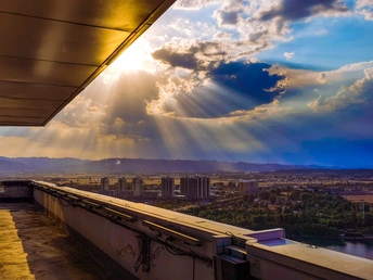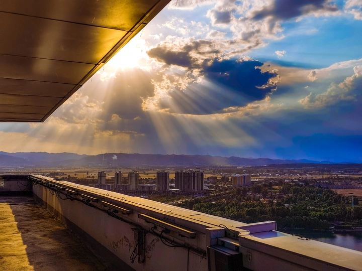 夏季,阳光透过云层照射城市高楼!那一缕缕光景色迷人!