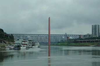 游玩重庆,乘游船沿嘉陵江逆流而上,路过即将建成的红岩村大桥,在游船上拍下此张照片